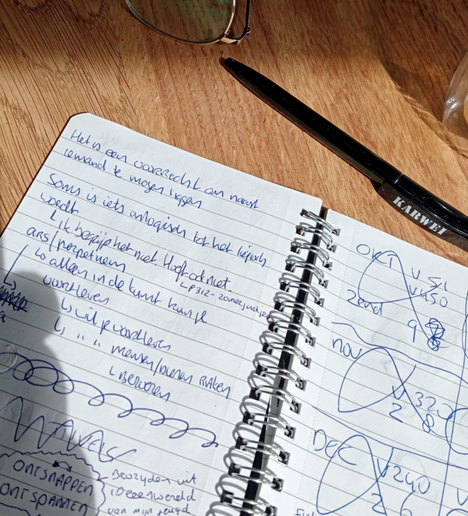 Ik open het blokje waarvan ik weet dat het al in gebruik is genomen omdat het dunner is dan dat het oorspronkelijk was. Agressiepapier. Het opent met allemaal letters uit het Griekse alfabet. Wow, dus al 6 jaar oud. Voorafgaand aan mijn Tour de CE in 2020 dacht ik even snel het Grieks te internaliseren. Kansloos. Ik blader verder en lees enkele citaten waaronder: “Het is een voorrecht om naast iemand te mogen liggen.”